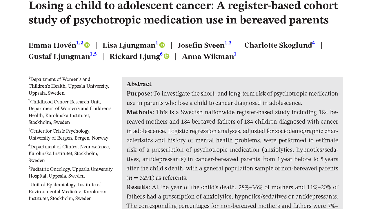 Losing a child to adolescent cancer: A register-based cohort study of psychotropic medication use in bereaved parents