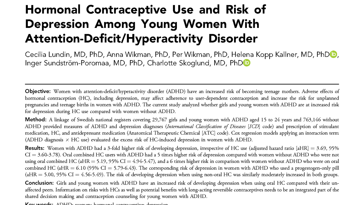 Kvinnor med ADHD har högre risk än andra att bli mammor när de själva bara är tonåringar. Orsakerna är inte fullständigt kända, men i den här studien visar vi att de har en högre risk än kontroller för depression när de använder p-piller.
